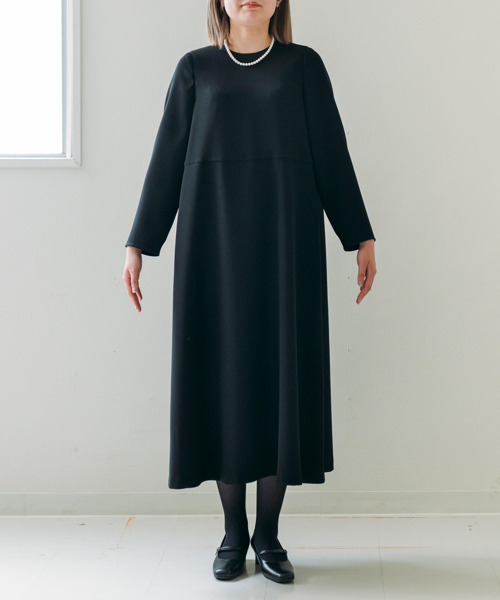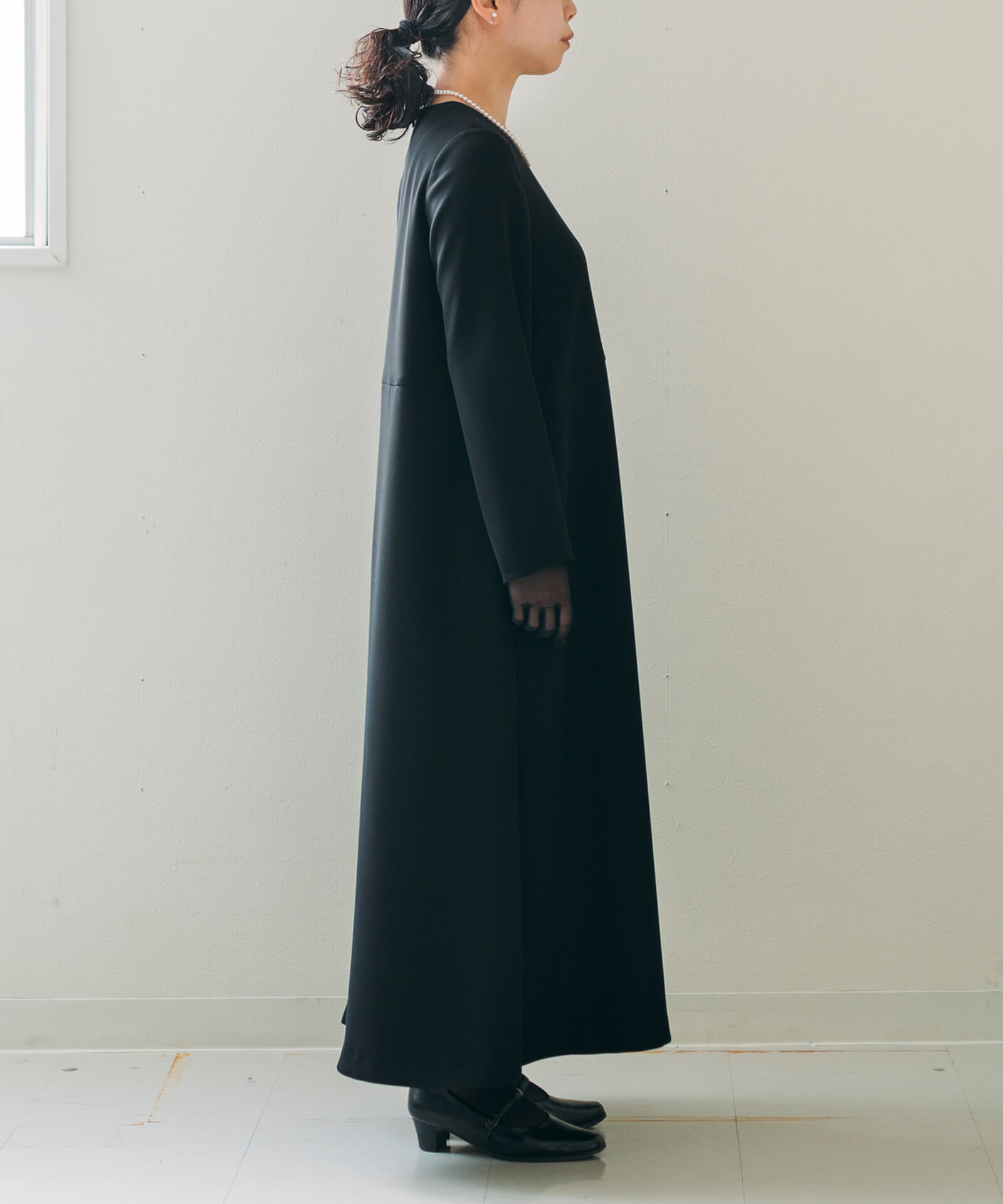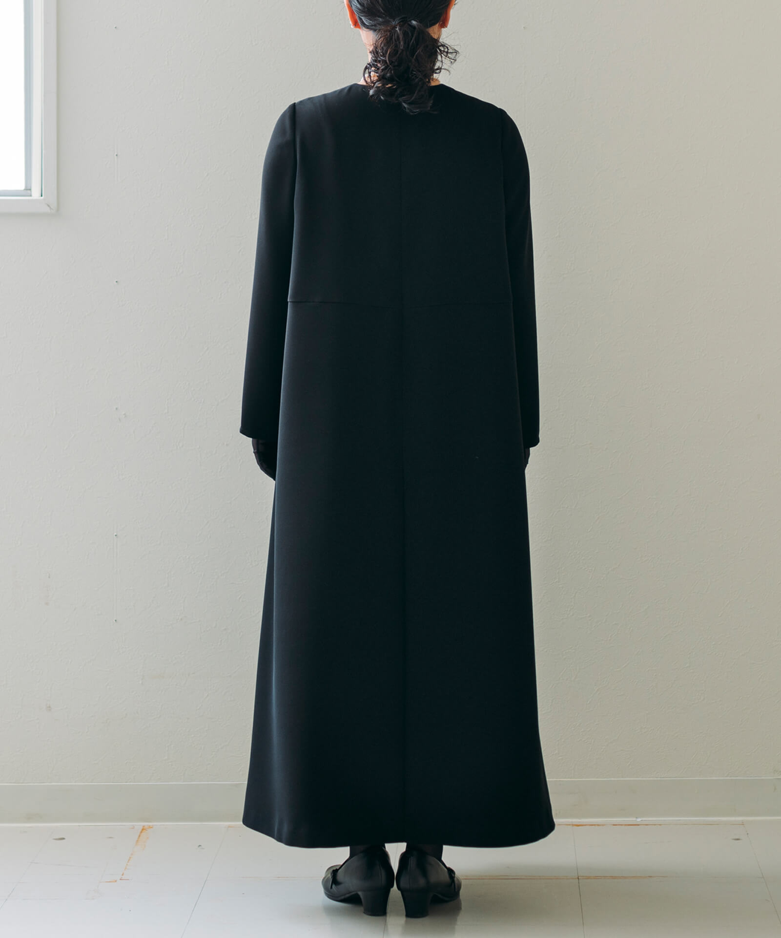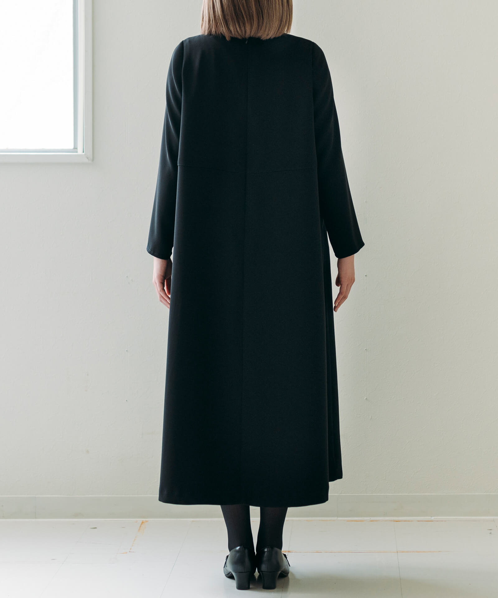 首元はつまり過ぎず、ゆったりしたラインに丈が長いため、妊婦さんも着ることができます。流れるような美しいAラインは、背を高く小顔に見せてくれる効果もあります。今回展開しているワンピースの中では、一番シンプルなデザイン。2種類どちらのジャケットにも合わせられます。前後にタックがないので、サイズアウトの心配も少ないデザインです。