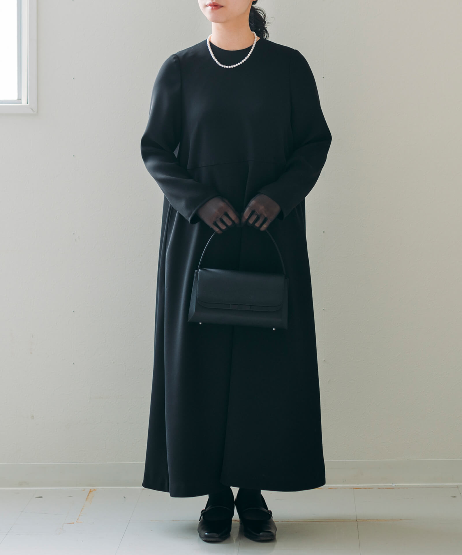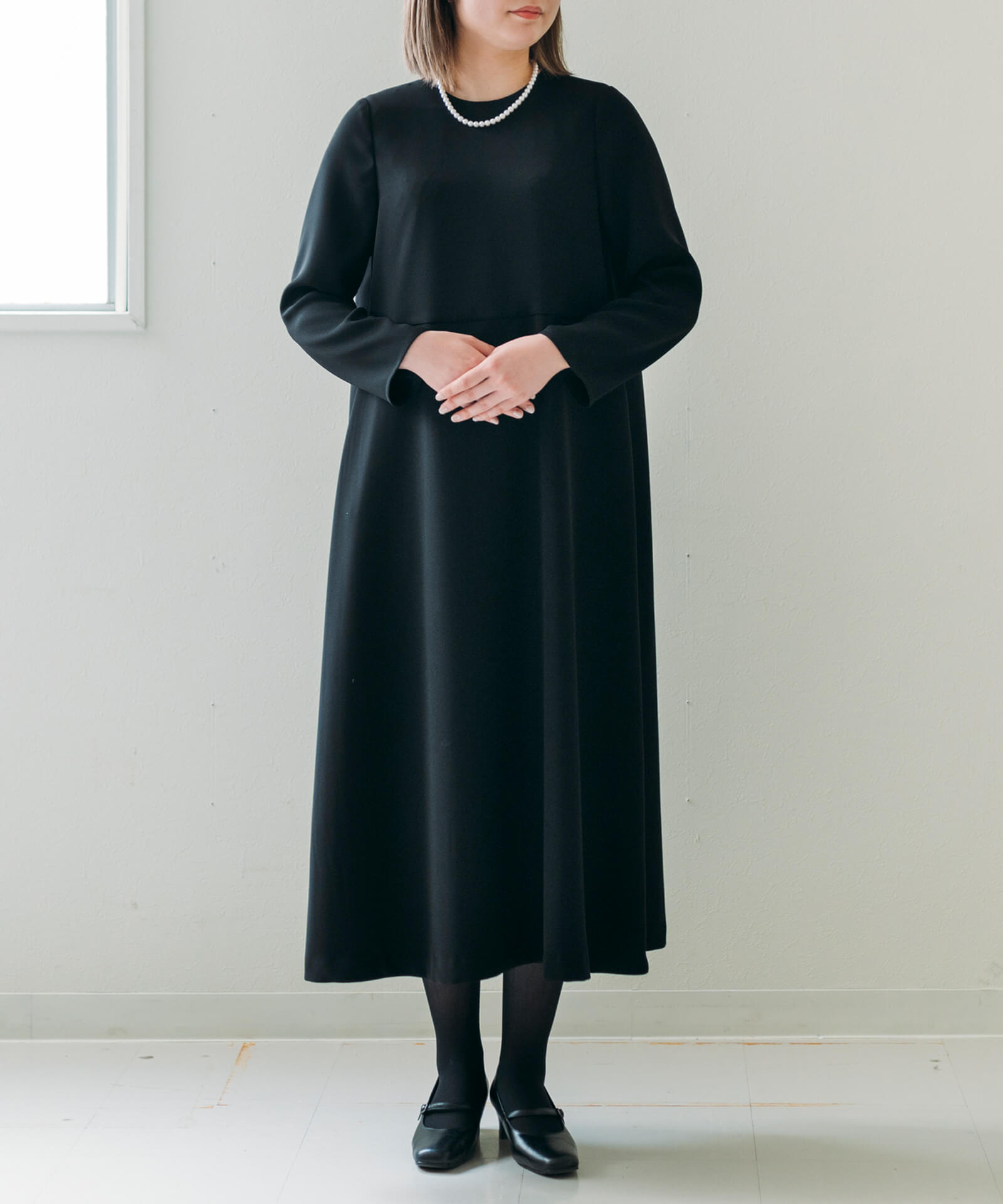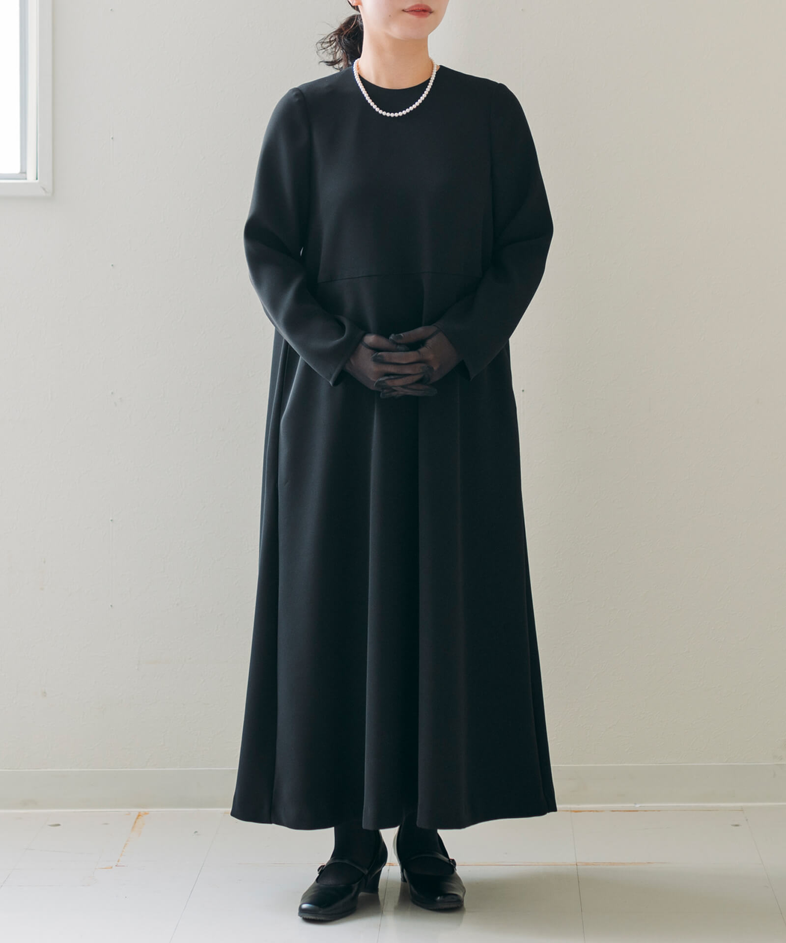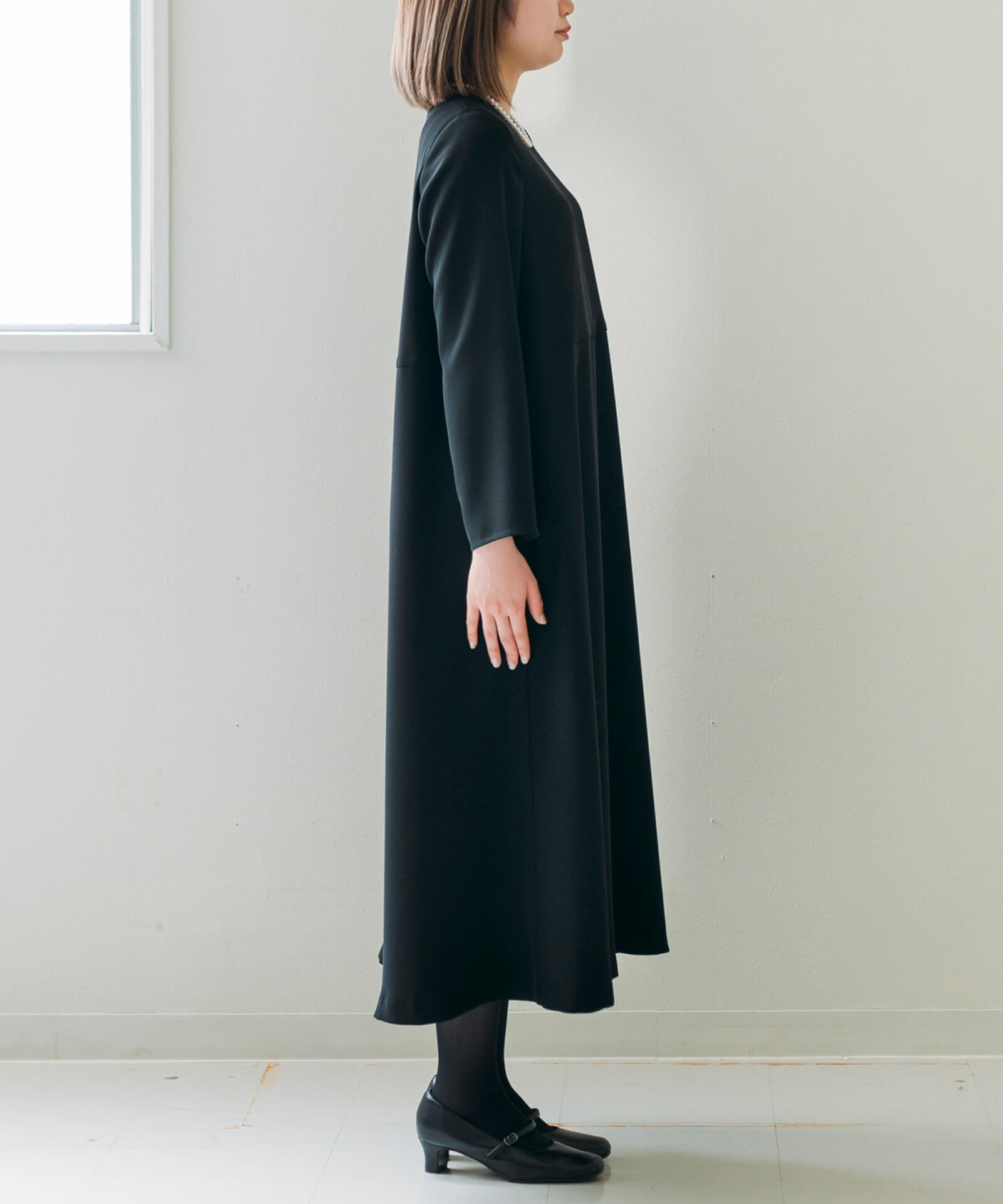 首元はつまり過ぎず、ゆったりしたラインに丈が長いため、妊婦さんも着ることができます。流れるような美しいAラインは、背を高く小顔に見せてくれる効果もあります。今回展開しているワンピースの中では、一番シンプルなデザイン。2種類どちらのジャケットにも合わせられます。前後にタックがないので、サイズアウトの心配も少ないデザインです。