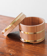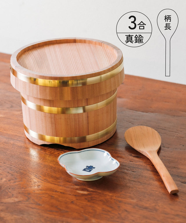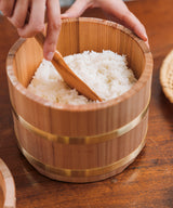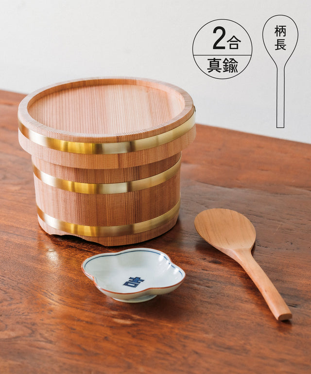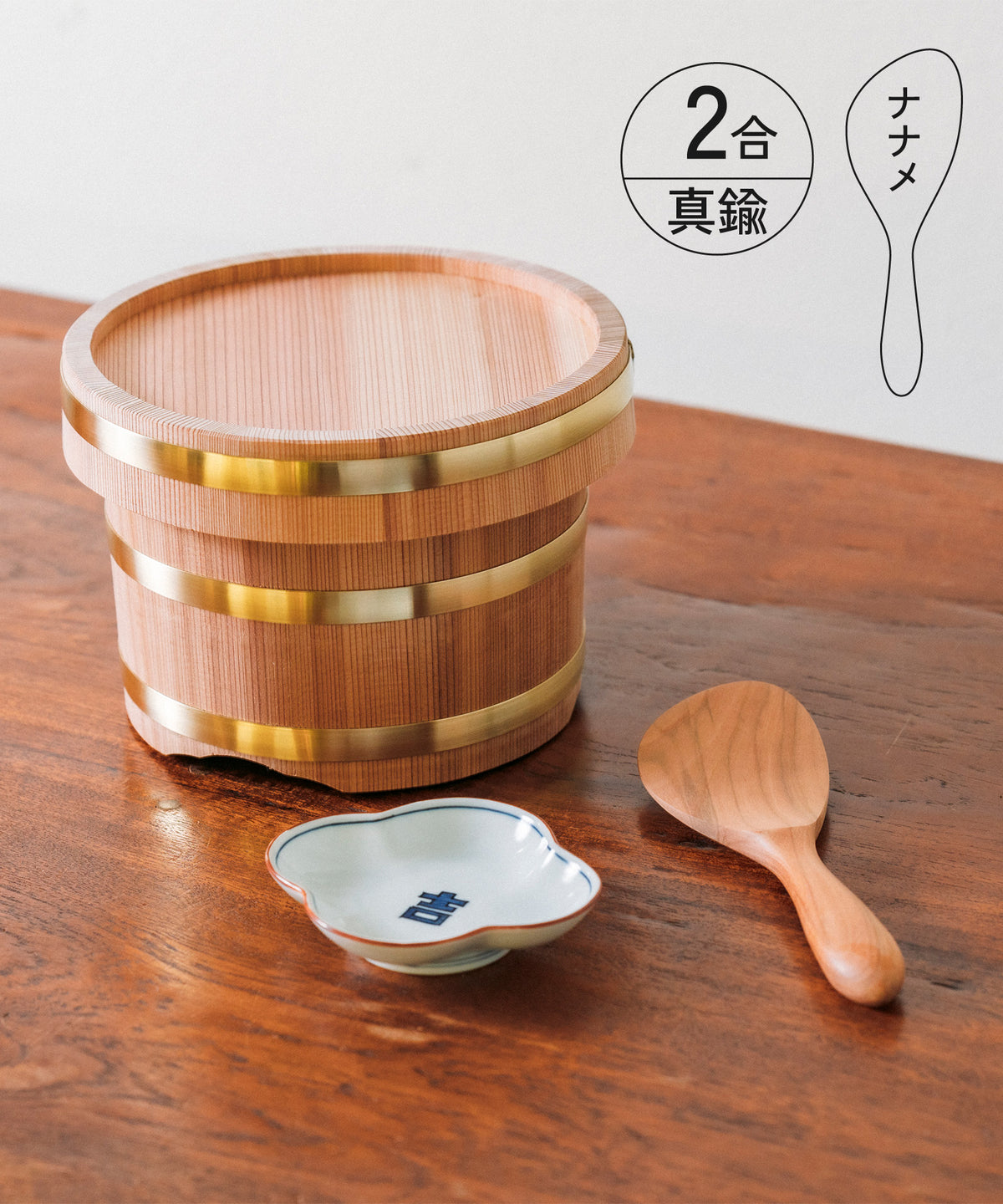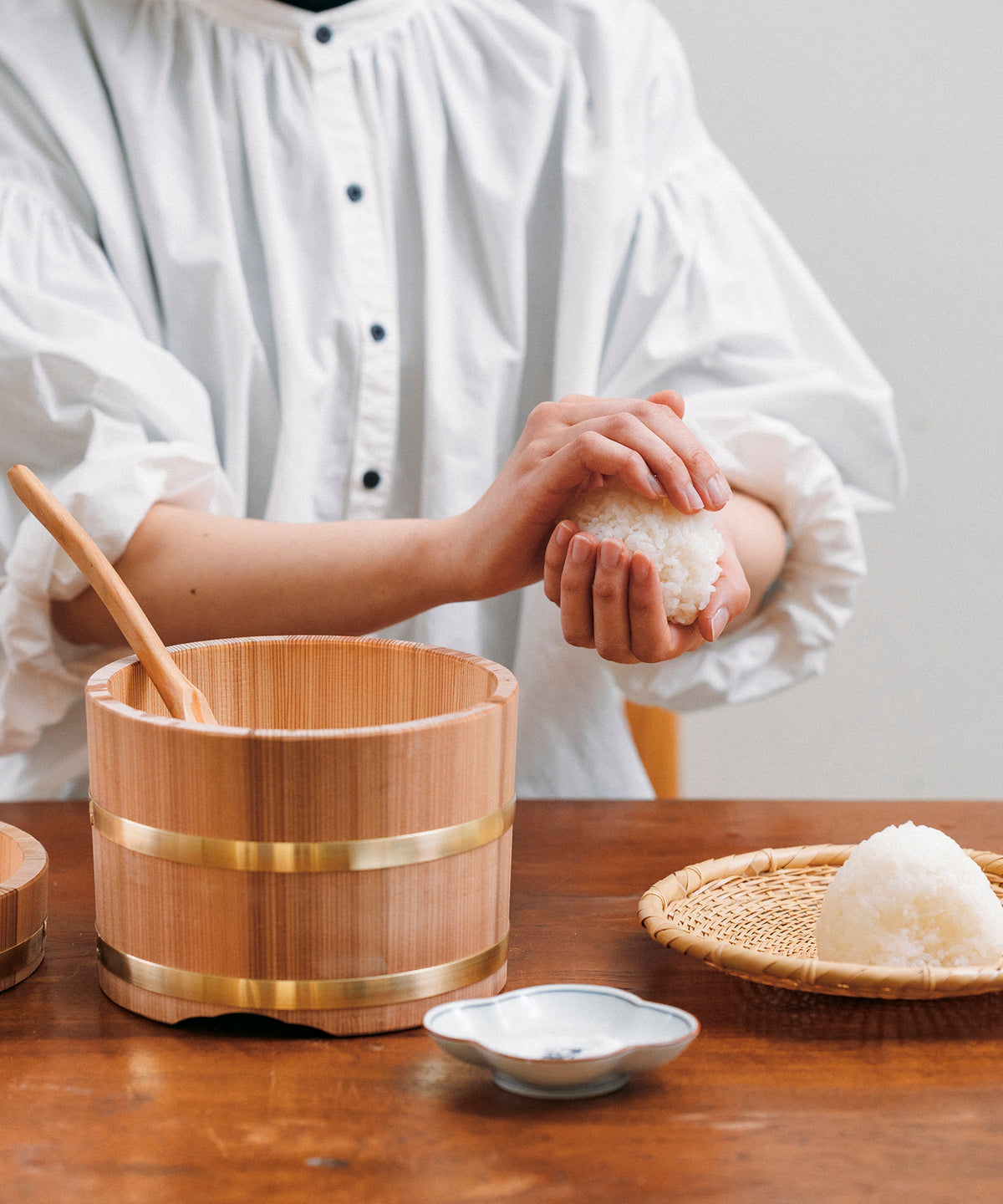 炊きたてのごはんを食卓まで運んだり保存したりするためのおひつ。木のおひつは水分を吸ったり放ったりする性質があり、ごはんの水分量をほどよくキープしてくれます。冷えても固まらず、ふっくら。温めなおしてもべちゃっとしない。ご飯をおいしいくいただくための先人の知恵が詰まっています。おひつにいれて冷めたごはんは甘みと旨みが立って、お米本来の美味しさがより深く感じられます。おむすびのおいしさを何倍にもしてくれる道具です。