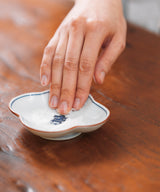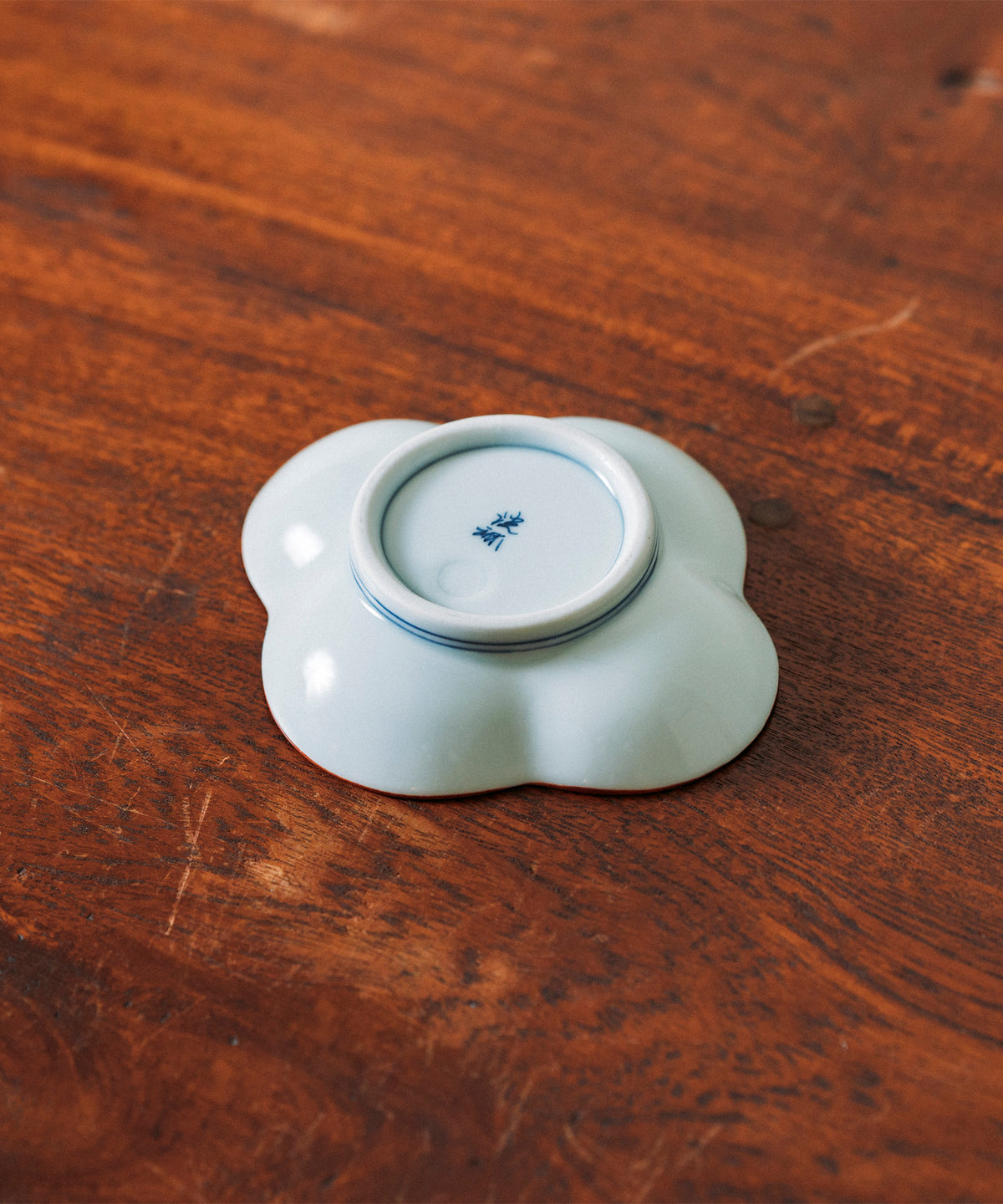 横長の花びらのような木甲(もっこう)型の小皿。古くから愛され続ける人気の形です。おむすびをにぎる時の手塩皿としてちょうど使いやすいサイズ。作り手の洸琳窯は波佐見焼では珍しい手描きの窯元で、塩の間からひょこっとのぞく「吉」の字が可愛らしく、「今日もきっといいことあるよ」と言ってくれるかのよう。おむすびを握るたびにちょっと明るい気持ちにさせてくれる小皿です。